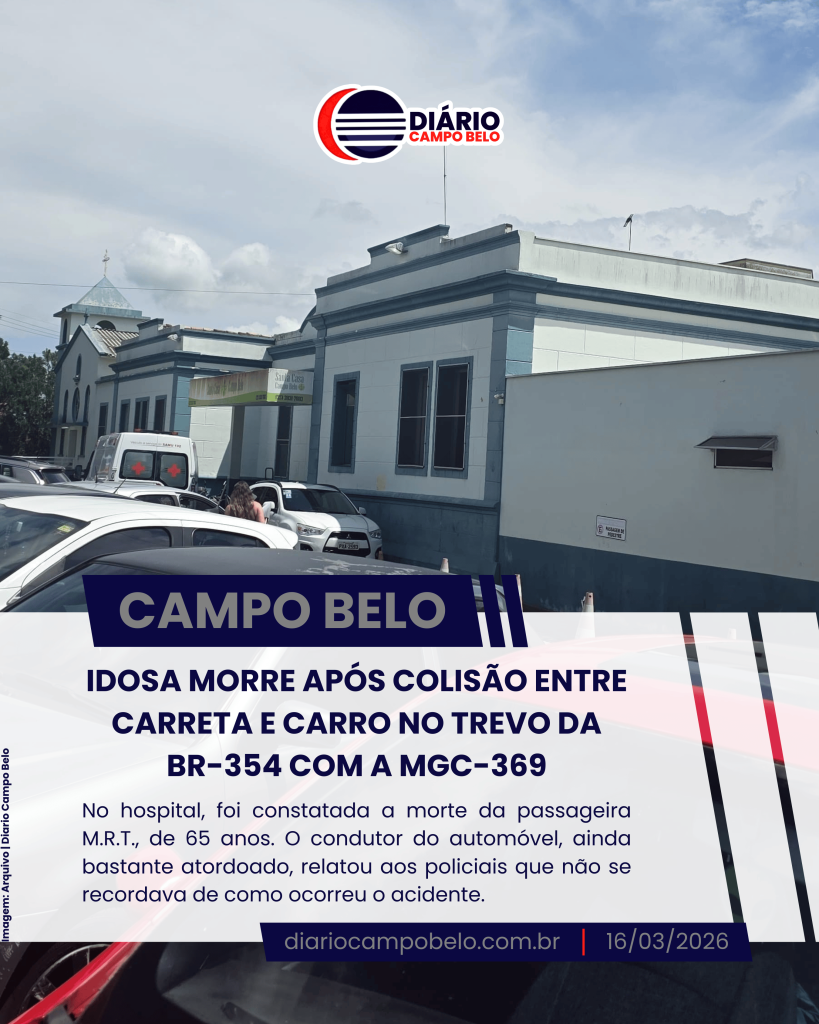 Uma mulher de 65 anos morreu após um grave acidente registrado na tarde desta segunda-feira (16) na BR-354, em Campo Belo. A colisão ocorreu na altura do km 555, no trevo de acesso à rodovia MGC-369. De acordo com a Polícia Militar Rodoviária, o acidente foi uma colisão transversal envolvendo uma combinação de veículos de carga (CVC), composta por caminhão-trator e dois semirreboques, e um automóvel Fiat Palio.
